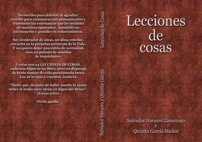 De tal forma que el Alma de la Tierra, uno de los hermanos del Sol, emprendió su cuarta encarnación, o toda la evolución del planeta Tierra. En la anterior evolución, el espíritu y la materia evolucionaron pacientemente. Todo siguió un proceso natural, de la misma forma que un ser humano encarna en un cuerpo. Tras inmensos periodos los impactos del Espíritu sobre la materia dormida, fueron despertándola y haciéndola autoconsciente. Es verdaderamente un problema que todavía no tenemos resuelto en nuestra civilización el origen de la autoconciencia. Tal y como está la informática, llegará un momento en que un ordenador será capaz de una vez almacenadas todas las posibilidades responder incluso más correctamente que un hombre, como de hecho ya lo está haciendo. Pero la pregunta que sigue sin respuesta es... Cuando se tenga la inteligencia artificial... ¿se podrá dar el paso a la autoconciencia? Parece ser que la materia atómica sometida continuamente a los impulsos constructores de la electricidad cósmica, puede llegar a dotarla de la cualidad de autoconciencia. La ciencia todavía no ha llegado a comprender el término "Materia Inteligente", pero el esoterismo es algo que considera como un hecho y que es el fundamento de toda magia. Así es que, cuando el Espíritu fecundó por cuarta vez cierto espacio del Sistema Solar, inició el proceso de evolución ayudado de ciertas autoconciencias ya existentes en el corazón del Sol. Esas autoconsciencias anteriores incluso a la creación actual del Sol, fueron las que unieron definitivamente el Padre Espíritu y la Madre Materia de nuestro planeta. Según nos indican algunos autores la autoconciencia de nuestro planeta surgió mucho más rápidamente por la actuación de tres factores eléctricos: Electricidad dinámica o Espíritu, Electricidad por fricción o Materia y ambos fueron unidos por la Materia Autoconsciente Solar que proporcionó la autoconciencia de la que actualmente disfrutamos. Siento que esto sea un poco tedioso. Sin embargo, es importante para el transcurso de la obra, pues es una forma de decir que los seres humanos estamos compuestos de tres elementos El primero el espíritu, el segundo el cuerpo y el tercero el alma o una materia muy especial que entre otras cosas tiene tres átomos muy particulares. Son los átomos permanentes: físico, astral y mental. Y puesto que ahora vivimos en la época de los ordenadores y sabemos la memoria que se puede almacenar en un pequeño espacio, podemos intentar comprender que esos tres átomos contienen toda la información importante que un ser humano ha reunido en sus cientos de encarnaciones. Estos tres átomos son de vital importancia, son materia inteligente, incluso autoconsciente. Son como el código genético desde el que el Angel Solar puede diseñar el cuerpo mental, astral y físico etérico. Dicho de otra forma, son el tesoro más valioso de un ser humano. Los que unen momentáneamente el Espíritu con la materia, puesto que estos átomos son la materia más evolucionada jamás creada. El lector podrá comprobar, conforme vaya leyendo el libro Lecciones de cosas, que en algún momento hubo un acercamiento entre las dos mentes. Escribir es un acto creativo. Aparentemente, las palabras surgen de la nada. Parece que se originan en el cerebro, gracias a todo lo que hemos leído, estudiado, vivido y meditado, pero también se tiene la extraña sensación de que brotan espontáneamente. Esto es lo más bello para un creador artístico. El dulce momento en el que no habiendo nada, la trama se va originando. Hay personas que trazan, diseñan los libros, confeccionan fichas de cada capítulo y luego comienzan la obra. En mi caso no es así. Simplemente me pongo a escribir y nunca sé dónde terminaré. Cada siguiente capítulo va surgiendo una vez finalizado el que se está escribiendo. Después de un agradable paseo contemplando el sol del atardecer, visualizo la energía que traza un ocho horizontal, o símbolo del infinito, cuyo centro es el eje vertical imaginario que se prolonga más arriba del centro del cerebro , y pronto aparece el siguiente paso a dar en la trama de la obra. Es por ello, según mi opinión, que en algún momento los cerebros-mentes que tienen alguna clase de afinidad o amistad comparten conocimientos, y en mi caso extraigo, o soy influenciado por esas abstracciones que permanecen en otro lugar. Estimado lector, delante de ti hay un extenso y profundo libro, del que el último capítulo es lo más querido para su autor, si bien es un tanto abstruso, y que requiere mucho estudio. En algún lugar se puede leer que aquel que comprende los ciclos y los números es un iniciado. Así pues, supongo que será normal que al lector algunos conceptos se le escapen, como también me sucede a mí. Ocurre, en numerosas ocasiones, que la enseñanza más importante de quien para nosotros puede ser un maestro, sea incomprendida, porque esa parte es la más afín a la forma de pensar de una mente determinada y la que menos se puede comunicar. Como siempre, hay que recalcar que los libros de Don Salvador Navarro Zamorano son para leerlos despacio. La lectura apropiada de los mismos sólo la harán aquellos que sientan una vibración parecida a la de su mente, y les provoque una curiosa atracción, pues su pensamiento tiende a las abstracciones matemáticas y filosóficas. Este último año ha sido importante para nuestro querido amigo. Ha sacado a la luz gratificantes libros que hablan del universo, de los dioses que habitan en él y de los hombres, sus pálidos e inconscientes reflejos. Nos ha deleitado con maravillosos viajes por los mundos de la mente que todo lo abarca e impregna. Ha sido un largo periplo por espacios desconocidos, esos territorios que como los antiguos descubridores, nos ha mostrado con el cariño de un Maestro: Don Salvador Navarro Zamorano. Con profundo afecto.